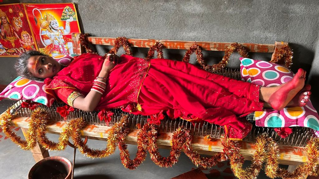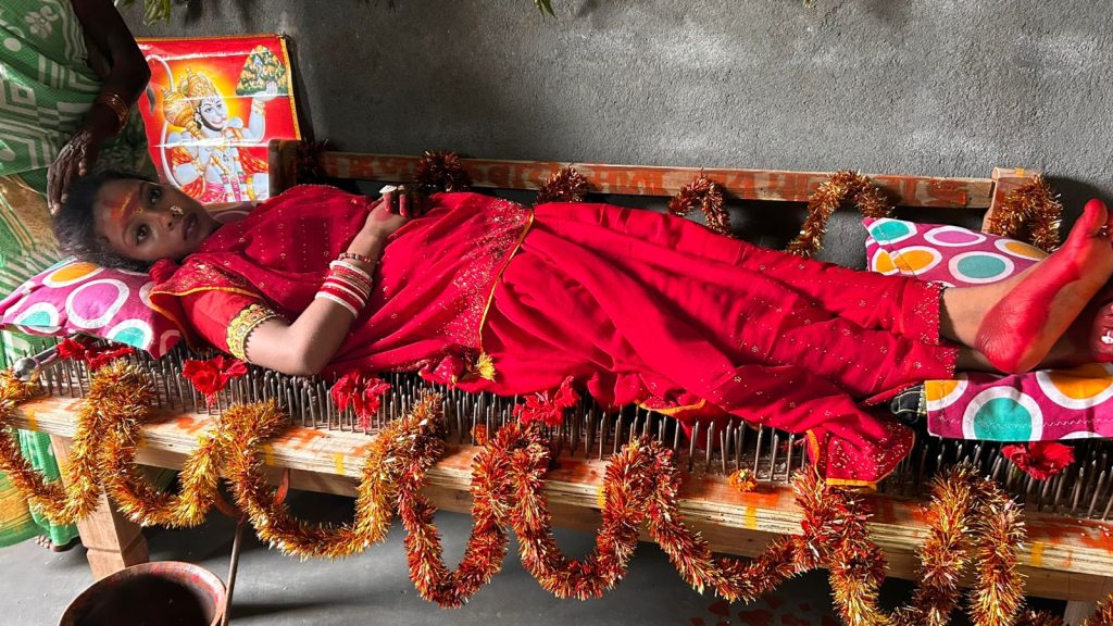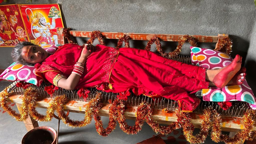 अनीशा की माँ सीमा देवी ने बताया कि कुछ दिन पहले अनीशा को स्वप्न में माता रानी के दर्शन हुए और माता ने साधना करने का आदेश दिया। इसके बाद परिवार ने चौकी तैयार कराई, जिस पर 32 किलो काटी के नुकीले कील लगाए गए। प्रथम दिन से ही अनीशा साधना में लीन है।