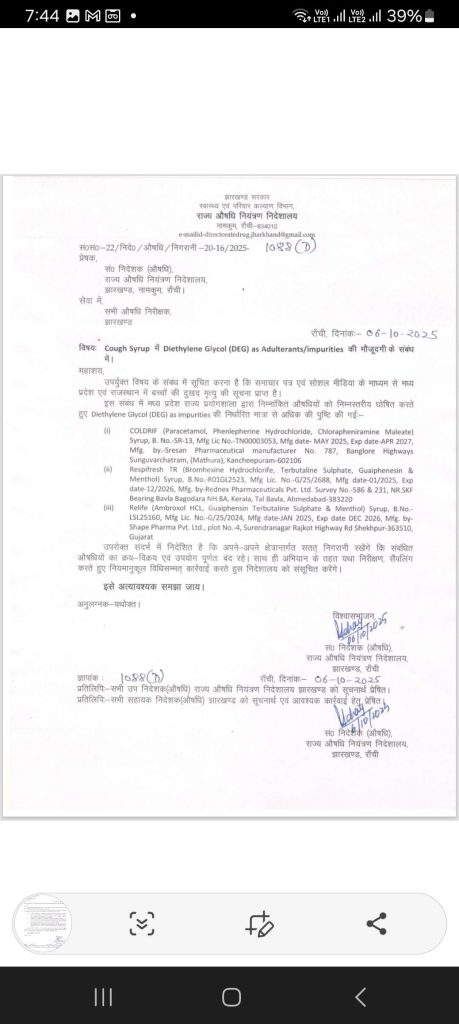 - चिन्हित सिरप की तुरंत जब्ती और नष्टिकरण की कार्रवाई की जाए।