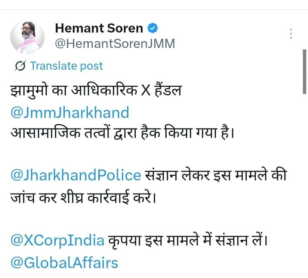 साइबर अपराधियो ने झारखण्ड मुक्ति मोर्चा (JMM) पार्टी का सोशल मीडिया एकाउंट किया हइचके