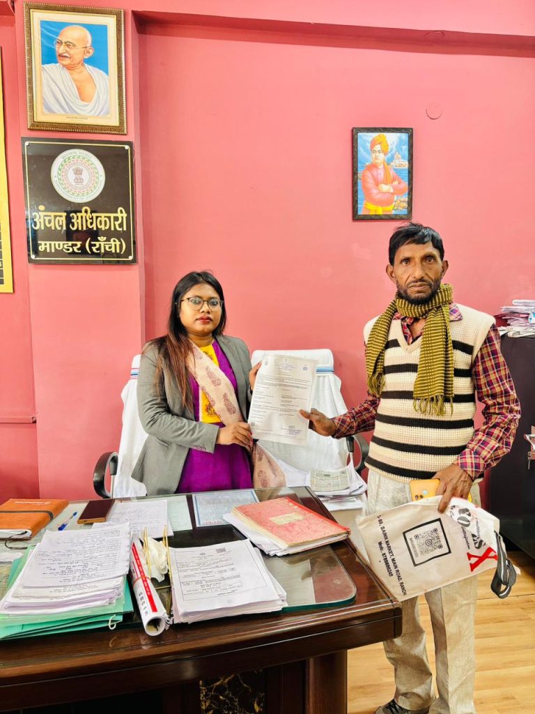 मांडर अंचल में आयोजित जनता दरबार में आवेदिकाओं सोभा तिर्की (ग्राम–सकरपदा), शाहरोन तिग्गा (ग्राम–ब्राम्बे) एवं पूजा कुमारी (ग्राम–चुन्द) को जाति प्रमाण पत्र निर्गत किया गया। वहीं सरिता कुमारी (ग्राम–चन्हो) तथा वसीम अकरम (ग्राम–जिंगी, कुरु) को जन्म प्रमाण पत्र प्रदान किया गया। इसके अतिरिक्त जेवियर तिग्गा (ग्राम–ब्राम्बे) के भूमि अभिलेख में रकबा सुधार से संबंधित आवेदन का निष्पादन किया गया।